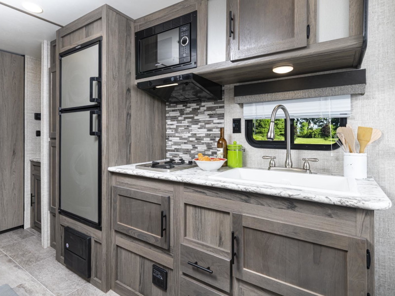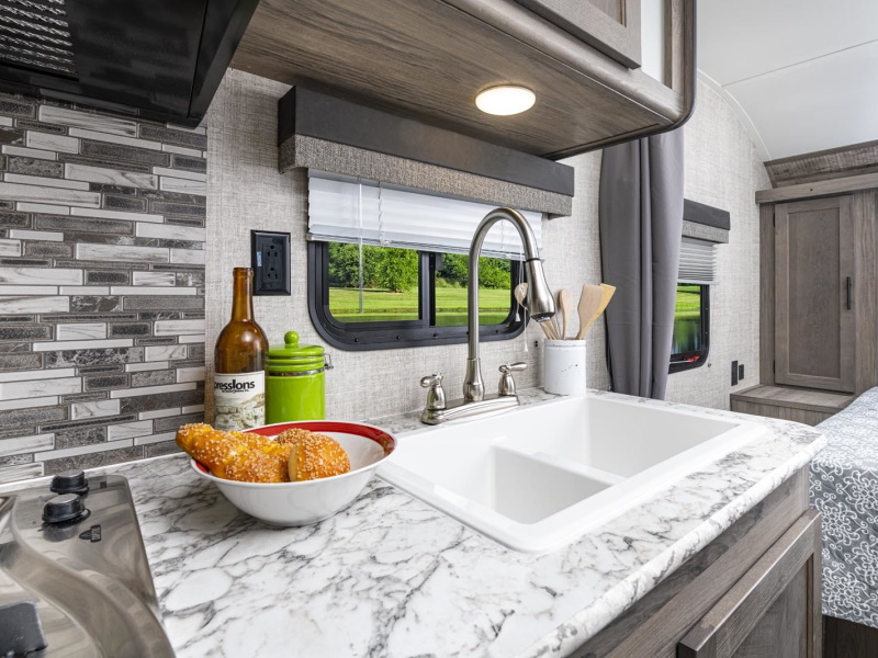 - Oversized tanks for fresh water (30 gal), grey water (36 gal) and black water (36 gal)